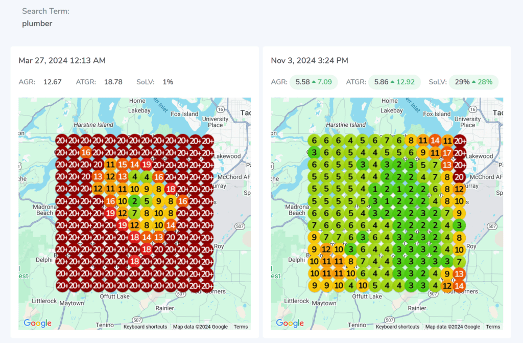 In our work with this plumbing contractor, one of the key tools we used to track progress was a geogrid—a visual map showing their Google Maps ranking across their service area in Lacey. Let’s break down what the geogrid means and highlight the significant improvements we achieved.
